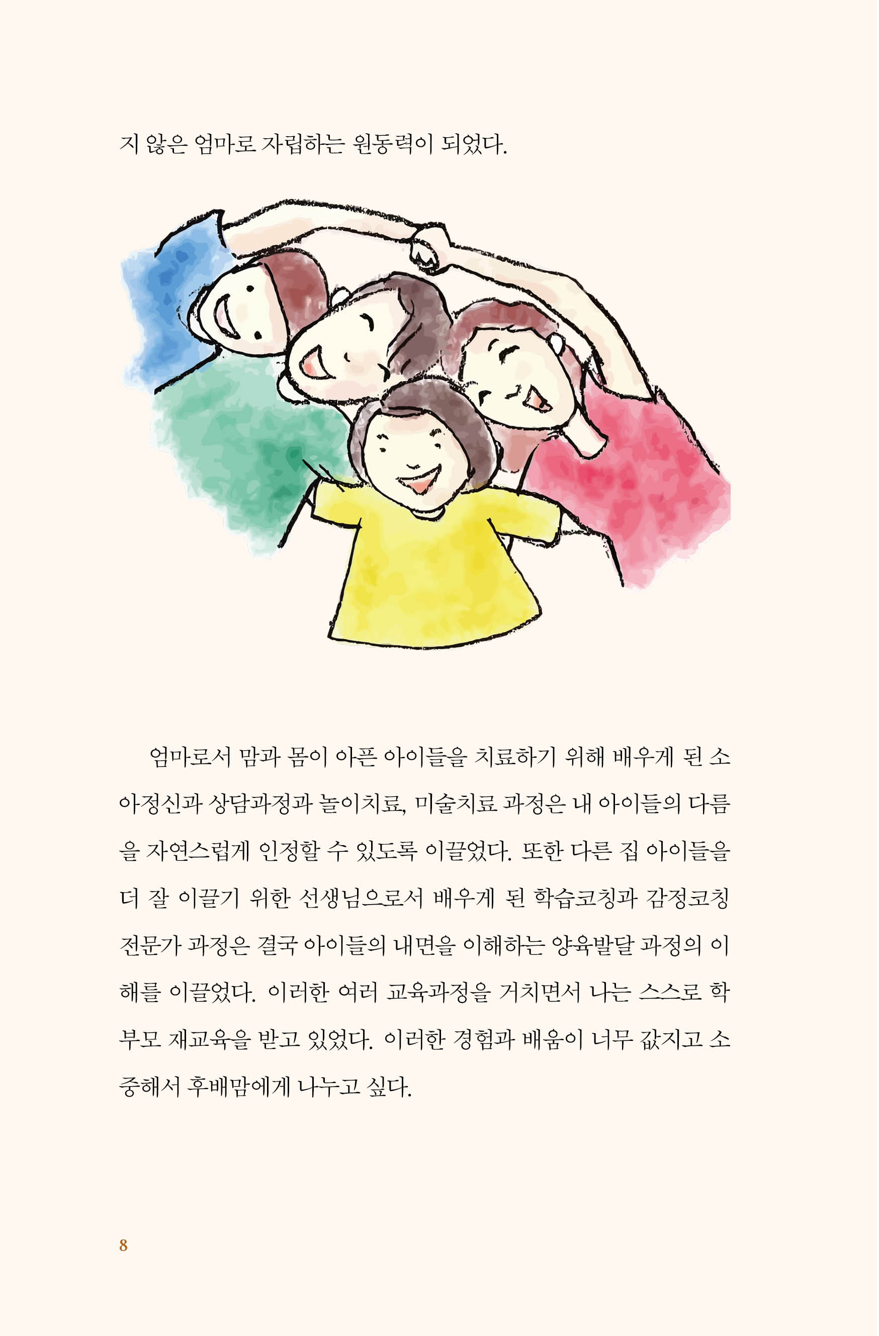 “자기소개서를 쓰거나 자기소개를 할 일이 많을까 하고 의문이 들지는 모르지만 아이들이 세상에 나서는 모든 순간이 자기소개를 하는 시간이다. 아이들은 단어에서 문장으로 자신의 욕구와 요구사항을 전달하기 시작한다. 그리고 세상을 향한 행동 몸짓을 시작한다. 학교라는 사회로 나가기 전 아이들은 가족, 또래 아이들, 처음 만나는 기관활동을 통해서 자기 자신을 바라보는 시선을 키운다. 내 이름은 무엇인지, 그리고 내 나이는 몇 살인지, 내가 좋아하고 싫어하는 것은 무엇인지 질문을 받고, 대답을 준비하며 성장하기 시작한다.”
