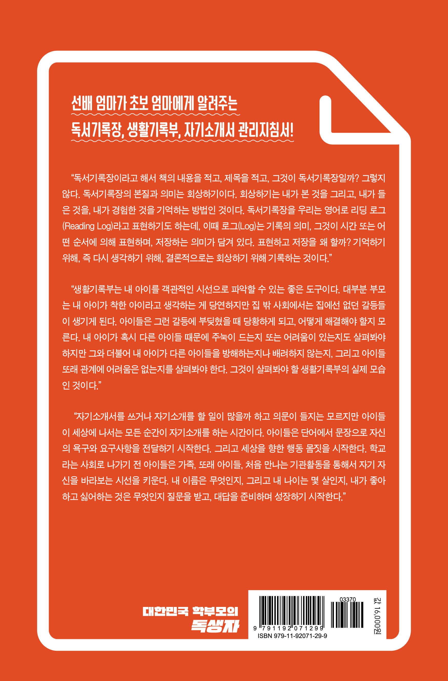 대한민국 학부모로 살아가기 위해서는 이제 학부모 또한 입시 전문가가 되어야 한다. 입학과 동시에 아이들이 처음 만나게 되는 교육 기본과정 중에서 가장 중요한 것을 꼽으라고 한다면 독서기록장, 생활기록부, 자기소개서 이 세 가지일 것이다. 이것은 입시에도 필요한 과정이지만 또 다른 관점인 어른이 되는 삶의 방식에서도 중요한 매개체가 될 수 있기에 이 독서기록장, 생활기록부, 자기소개서, 즉 ‘독생자’를 이 책에서 자세히 소개하고 있다. 자! 그러면 독생자의 교육을 위해 무엇을 어떻게 해야 하고, 또 학부모로서 무엇을 알고 있어야 할까? 그것을 이 책 「대한민국 학부모의 독생자」를 통해 선배 엄마가 초보 엄마들에게 전해주고 있다.